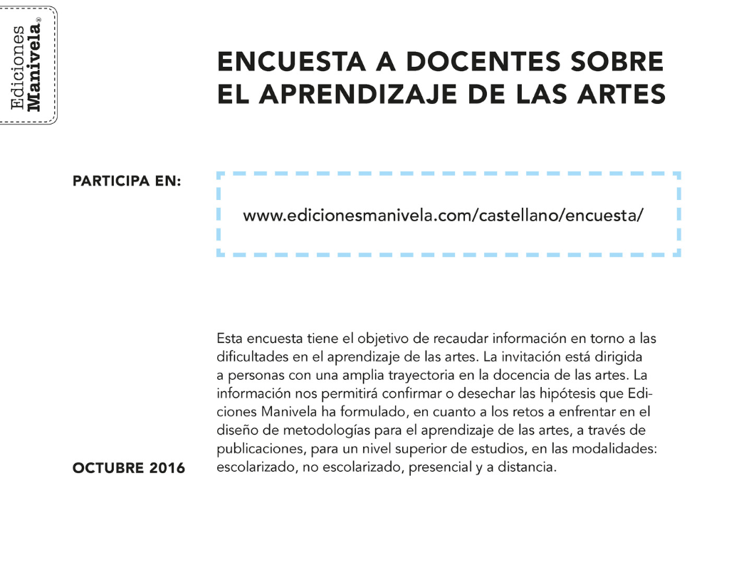 Esta encuesta tiene el objetivo de recaudar información en torno a las dificultades en el aprendizaje de las artes. La invitación está dirigida a personas con una amplia trayectoria en la docencia de las artes. La información nos permitirá confirmar o desechar las hipótesis que Ediciones Manivela ha formulado, en cuanto a los retos a enfrentar en el diseño de metodologías para el aprendizaje de las artes, a través de publicaciones, para un nivel superior de estudios, en las modalidades: escolarizado, no escolarizado, presencial y a distancia.